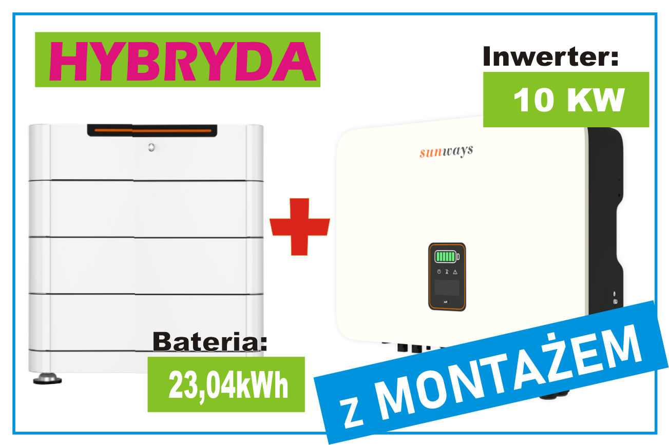 Zestaw, Inwerter hybrydowy 10KW + Magazyn energii 23,04 KWh z Montażem